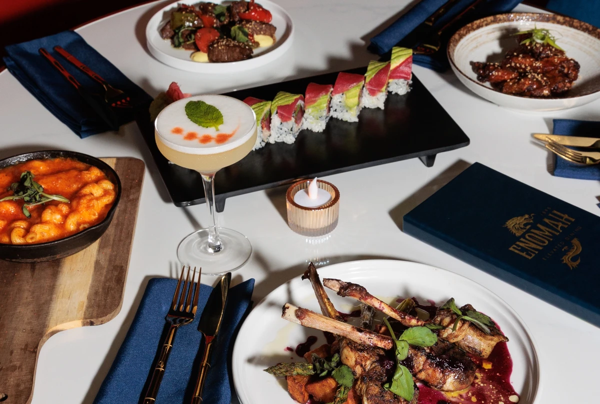 Right in the heart of downtown Detroit, ENOMAH 1895 redefines what it means to dine, drink, and vibe. This premier restaurant lounge blends bold culinary artistry with immersive nightlife, specializing in an unexpected yet unforgettable fusion of Asian-American and Caribbean soul cuisine. Each dish is a reimagined classic—rooted in tradition, elevated by innovation, and designed to comfort and impress. Step into a moody, refined atmosphere that sets the stage for an experience that evolves with the night. From elevated dining to curated DJ sets and live performances, the energy at ENOMAH builds as the evening unfolds. Whether it's a date night, celebration, or private affair, our exclusive dining suites offer a stylish space to create lasting memories.